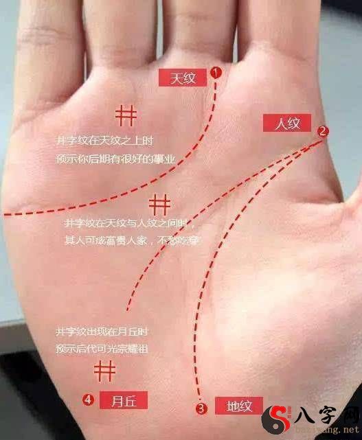 实际上便是井字纹。和星字纹、十字纹一样,这类纹路也是掌纹中意味着着兆头的纹路,出現在不一样、线纹之中所有着的运程含意是存有一定的区别。好像坐落于手掌心中的巽宫,也就是无名指正下方的木星丘得话,便可以提高此人所有着的财气非常充沛。