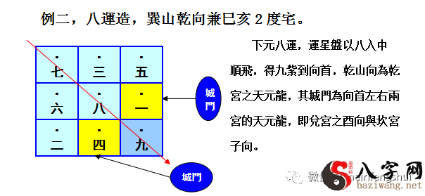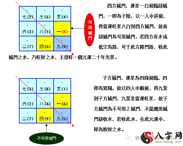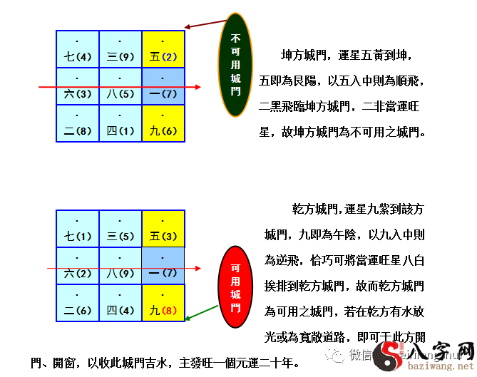 以飛臨城門之運星,遇陽則將該運星入中順飛,不可以將當運旺星排在此方城門,則此城門為不能用之地門。